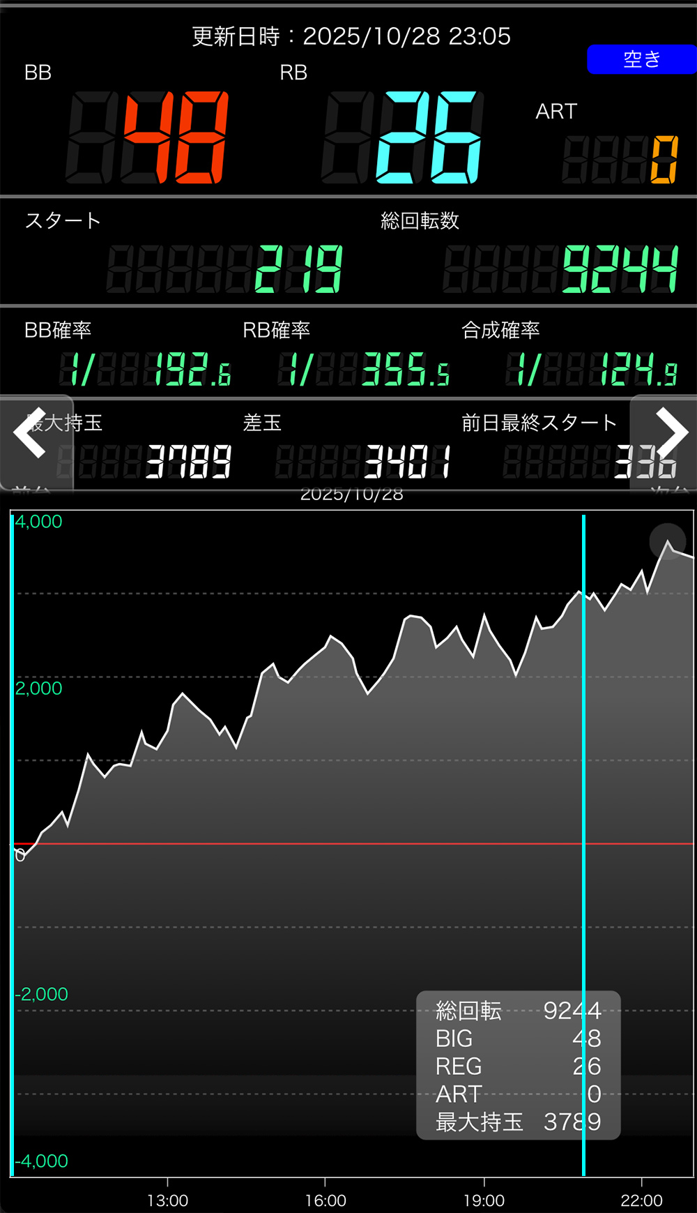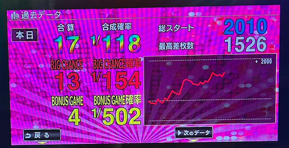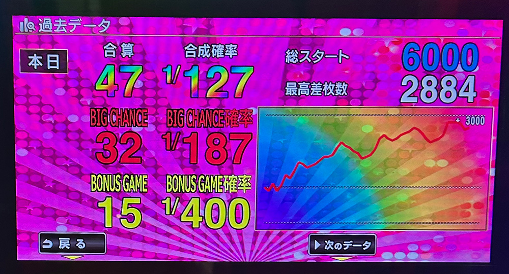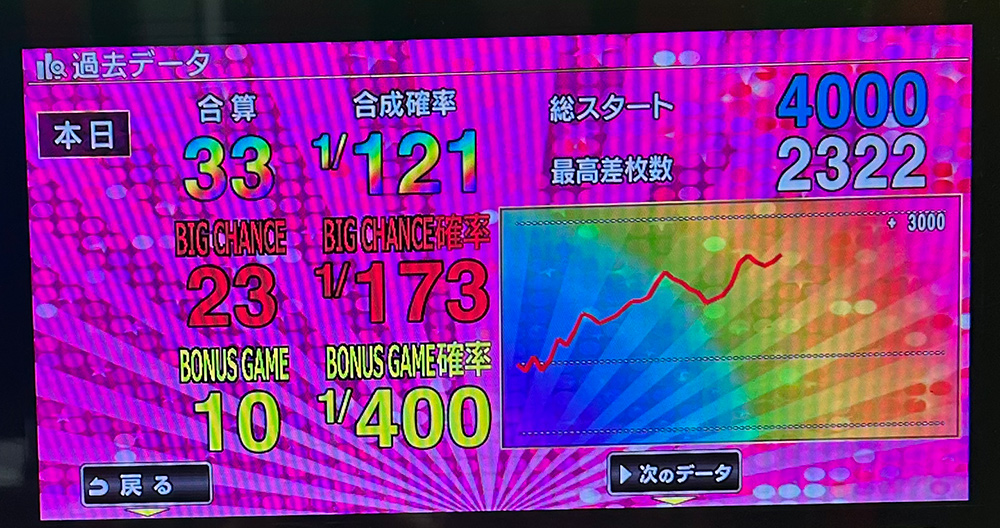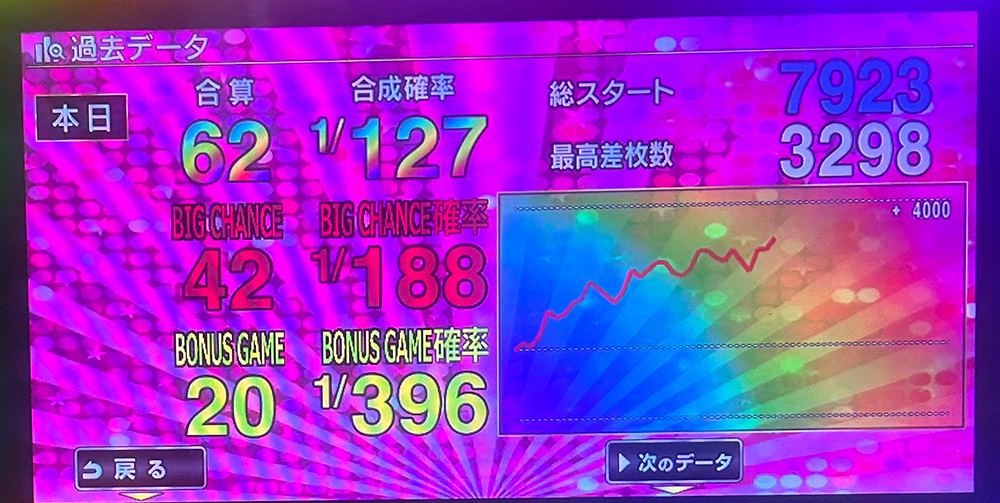 本当に数字が当てにならないジャグラー。たまたま低投資でグラフが伸びているから続けられているものの、BIG⇆REGでマイナス域にいたら粘れなかったであろう4000G。