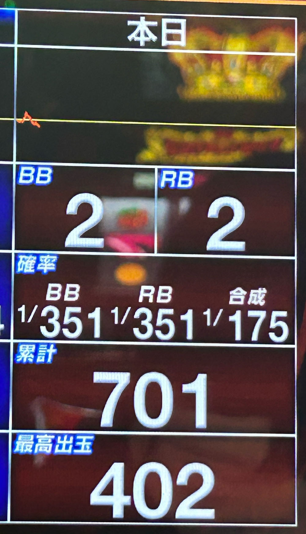 701Gごときで何が分かるという意見はごもっともだと思います。朝一は特に数字が荒れやすい。今2連しようものなら合算は1/117(高設定数値)です。