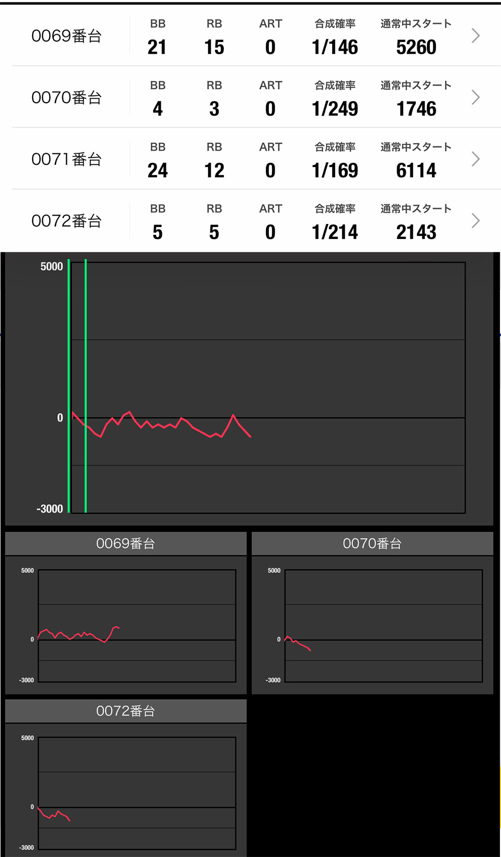 大きな勝ちを目指すには直近データからも日付末尾70番台は候補から外します。同様に72番台も高設定投入率が低いと判断。