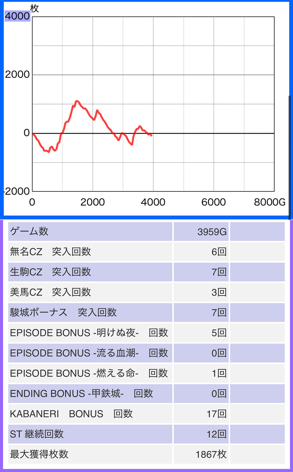 その間2回の駿城ボーナス(REG)を挟んだのは高設定挙動ではあるものの、カバネリは要所でSTではなく駿城ボーナスが出てくると設定6でも勝てないのは経験済です。