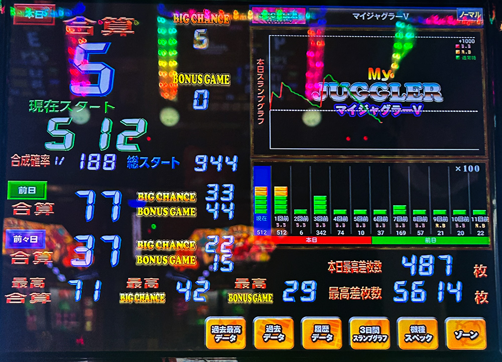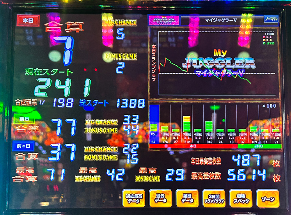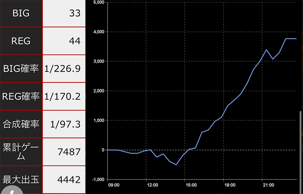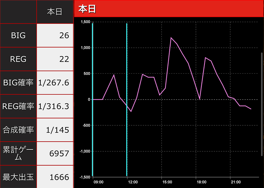 1388G単独REG0回で止めて途中で1600枚出てるのをリアルタイムで見た時はさすがに凹みました。それでも閉店時はしっかりマイナス。