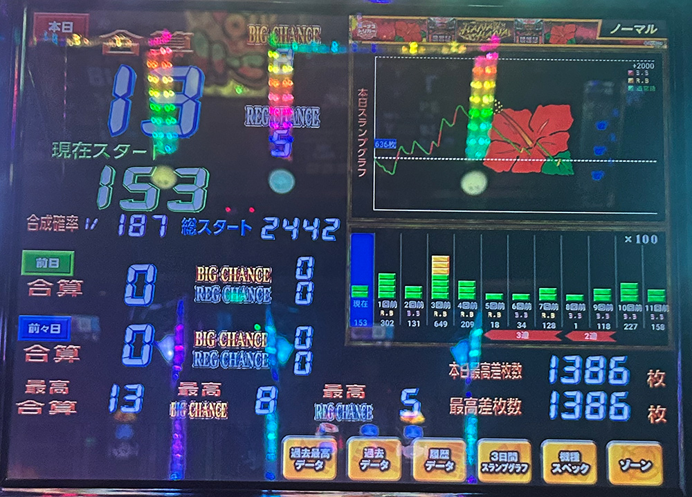 お隣の台は朝一1300Gハマってました。新台初日に1300Gノーチカなんて喰らおうものなら二度と打たないと思います😨