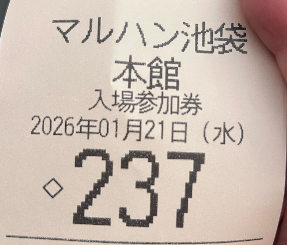 オワタ…😭実戦日は1月21日。21日はマイジャグの日。平日なのに250人。237番が出た時点で帰るが正解でした。