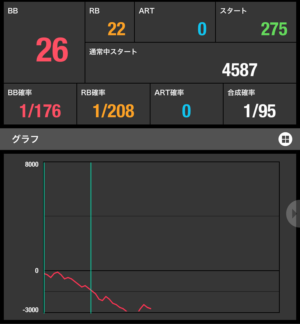 この時点でカバネリ減算ポイント設定推測的には設定5.6はなし。それでも中間設定があるなら追ってみても良いかと思いました(欲の塊が敗戦に繋がります)。