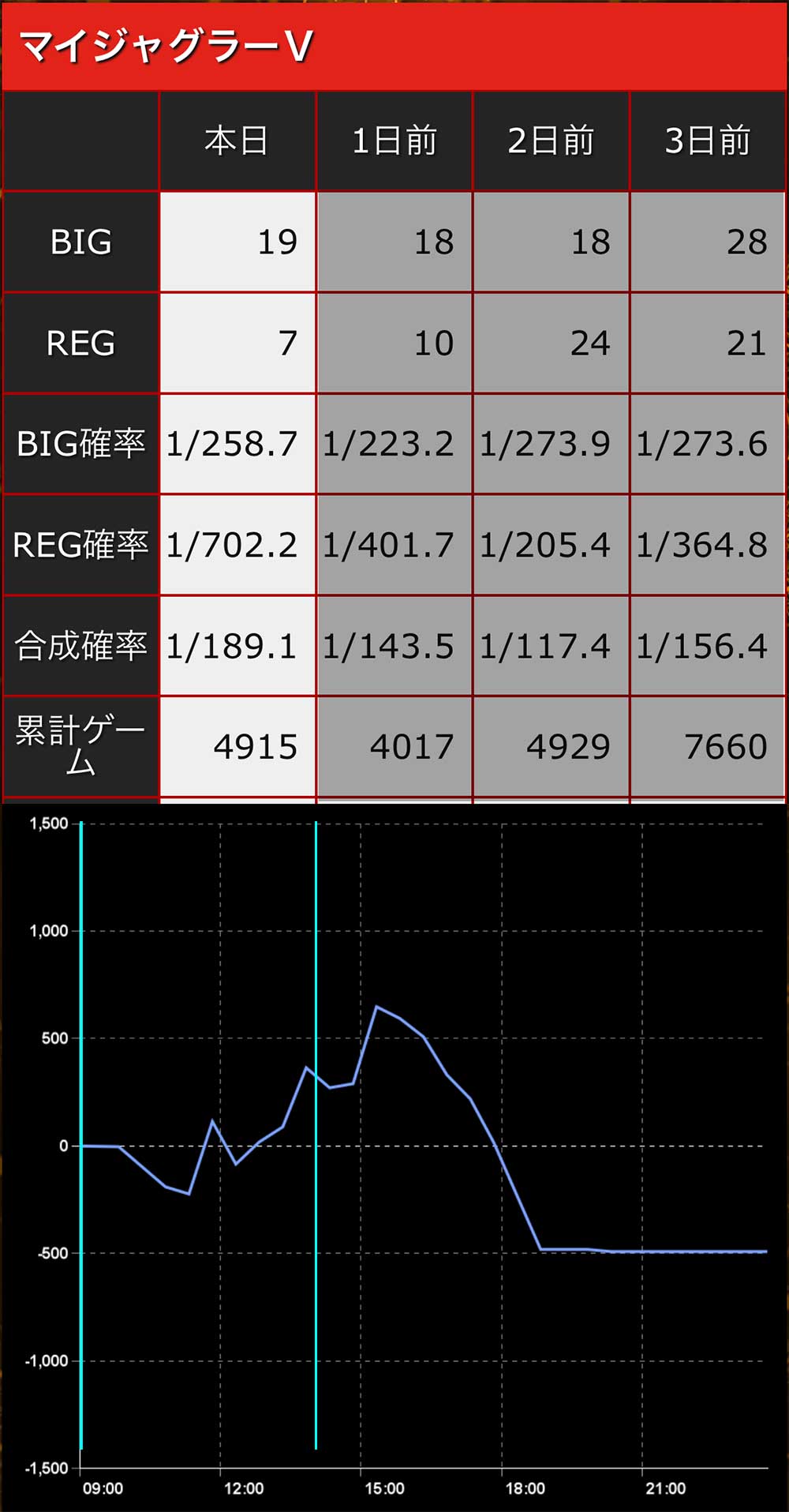 ジャグラーは座ったからには2000G回す。そもそも朝一少しハマったくらいで止めてしまうような台選びをしてはいけません。