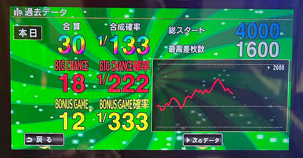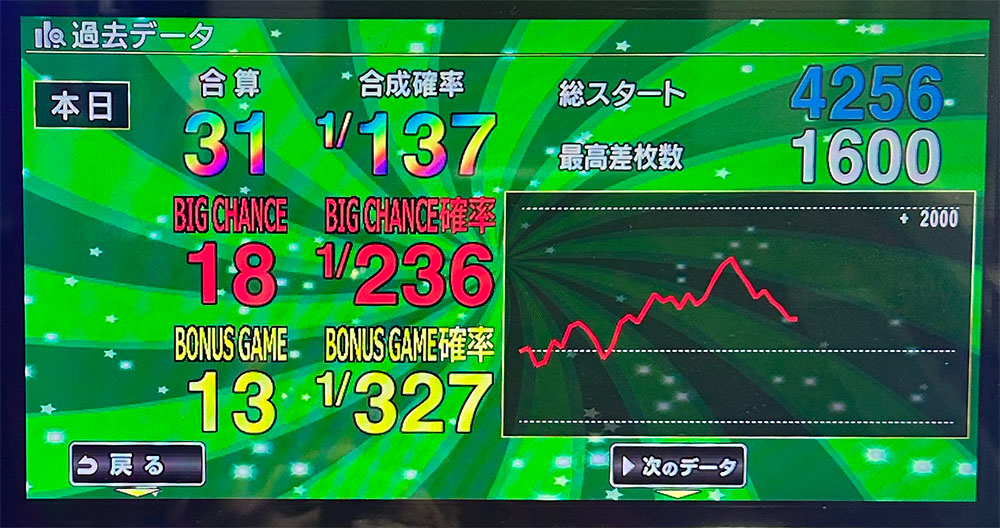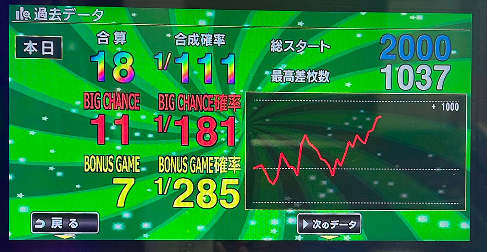 終了時は差枚1000枚。ということは、私が止めた後に伸びていたということでしょう。ただし、私が記録した最高値を越えることはありませんでした。