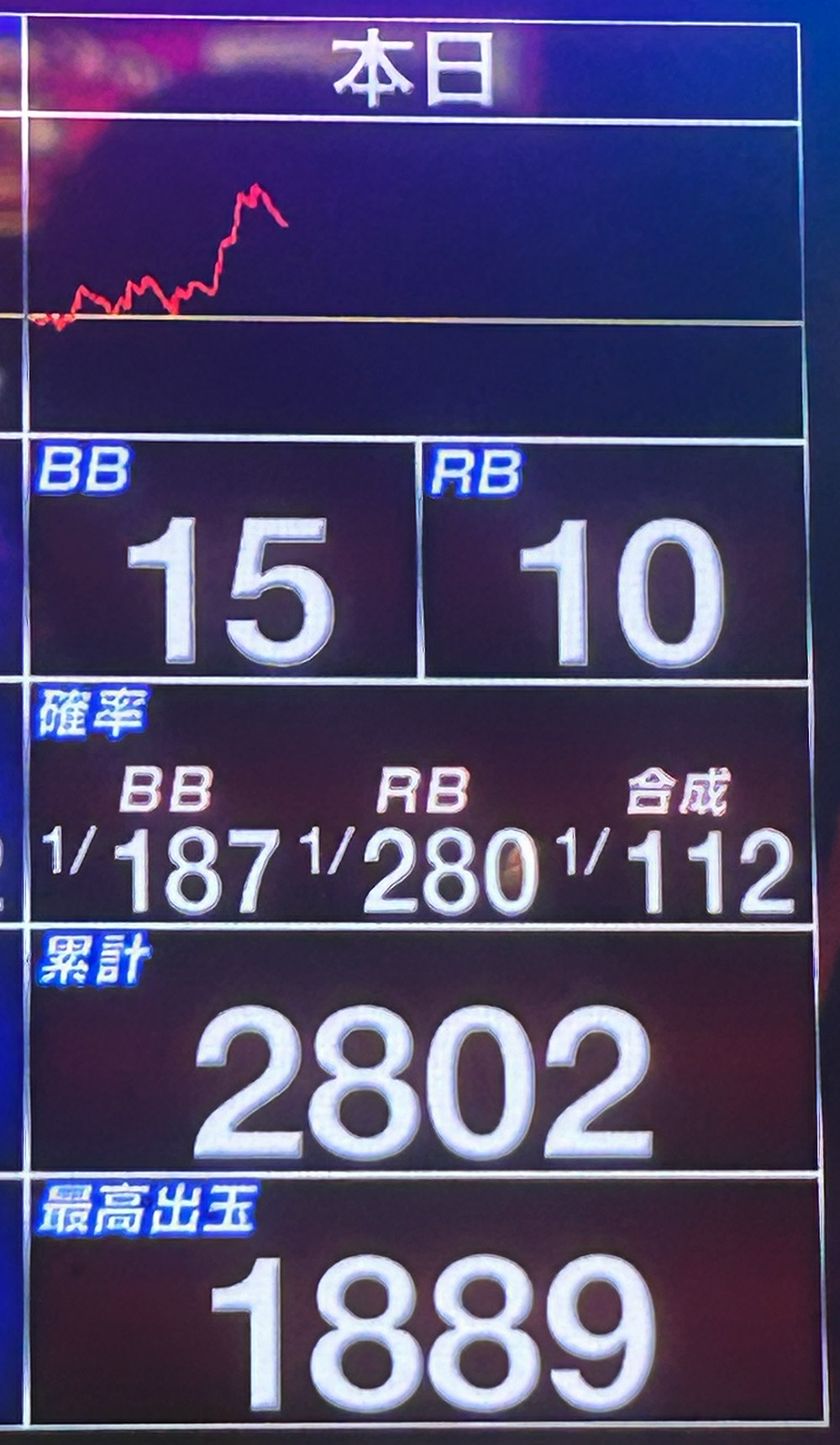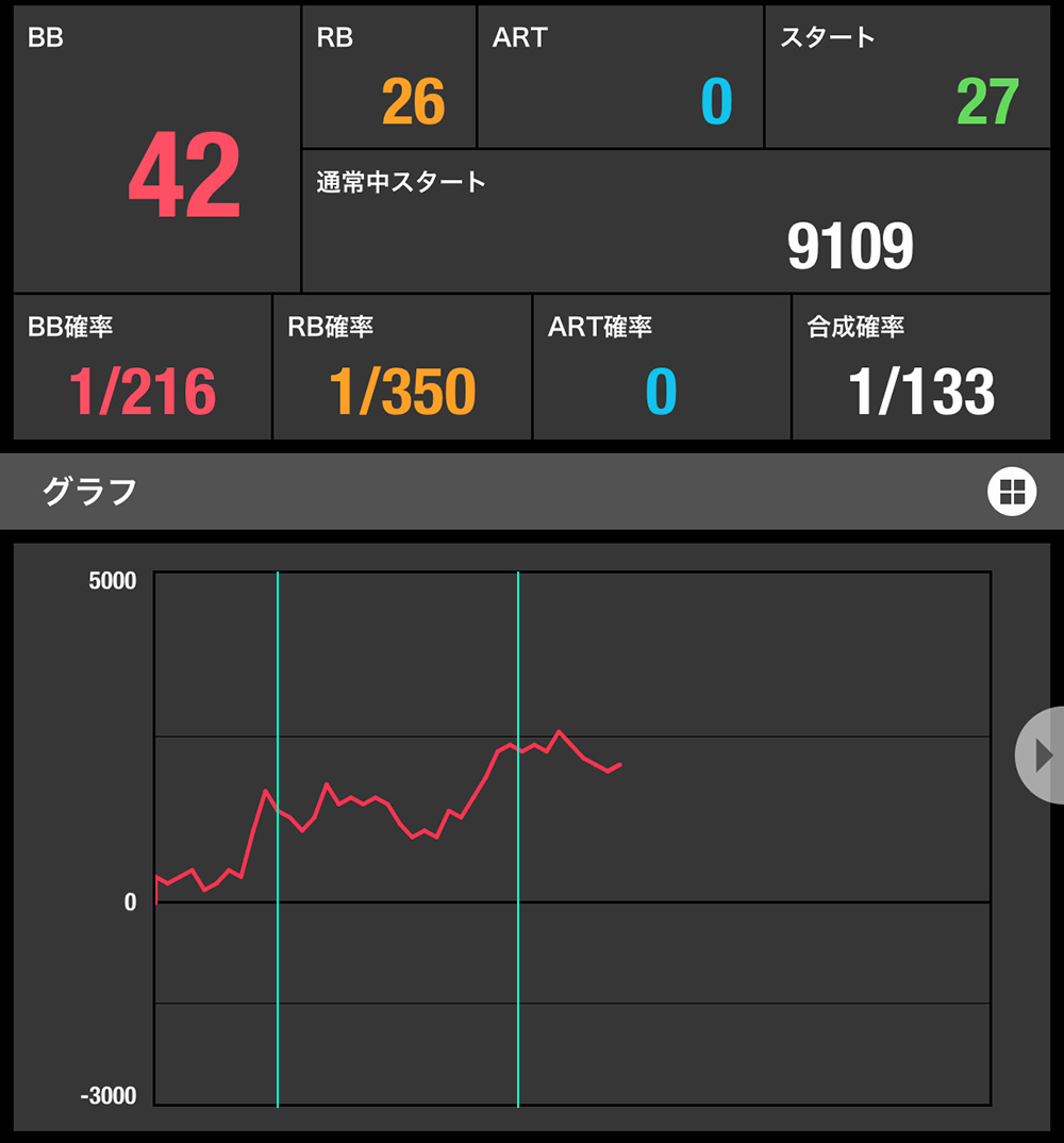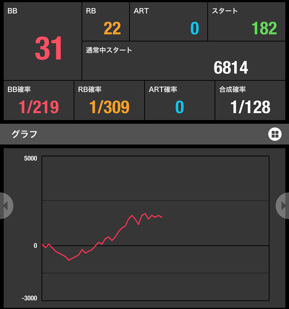 この日打っていた台も合算が良く、スランプグラフがプラスで推移していたから頑張れただけ。グラフが+1000枚くらいでミミズグラフ+合算1/150で下落していたら諦めていたと思います。