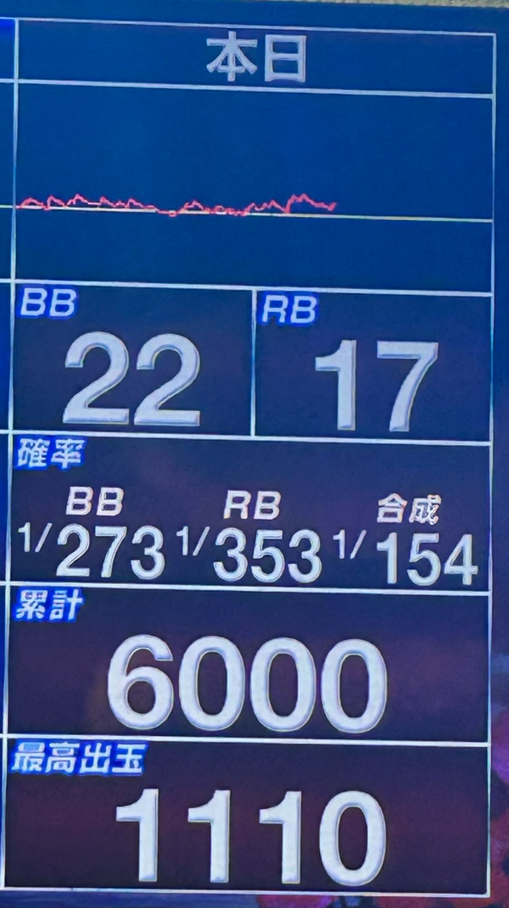 表面上の数字も内部的な数字も高設定そのものに仕上がった6000G。設定判別ツール的には設定3。REGサイドランプの青が圧倒的に多いからだと思います。
