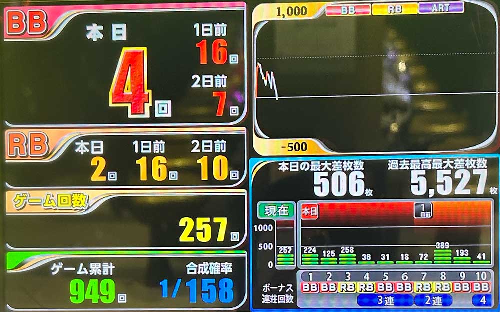 2日連続で敗戦してはしまいましたが、ジャグラーはぶん回せば一度はプラスになります。そこまで頑張ることができるか否か。プラスになった時に止めることができる決断力があるか否か。