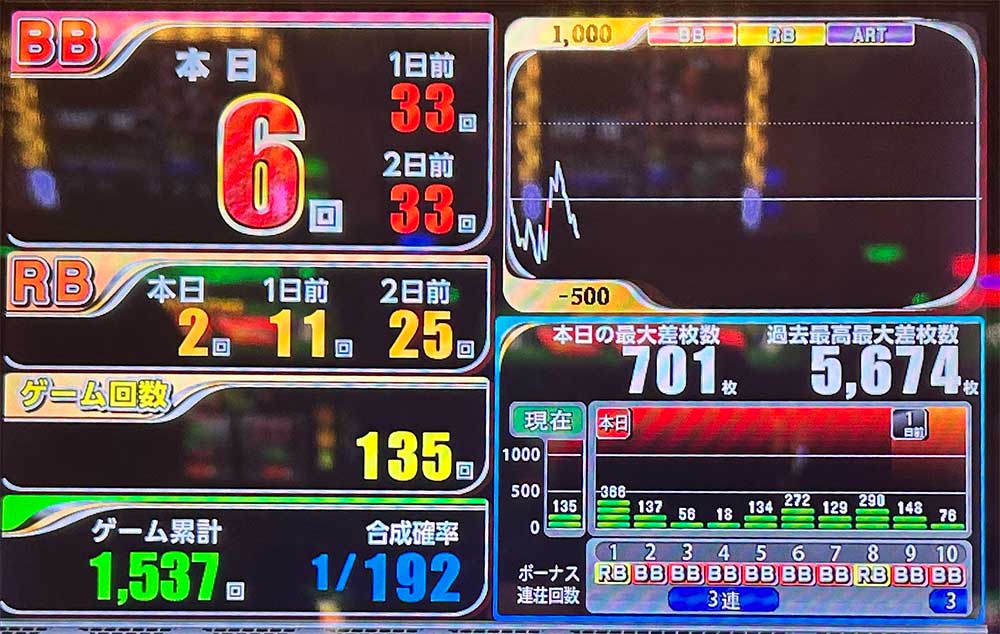やめ時合格点はBIG3連荘後でした。137Gという比較的早い当たりに追ってしまいました。 BIG3連荘してグラフは原点を越えたのに合算が上がってこないのは危険。