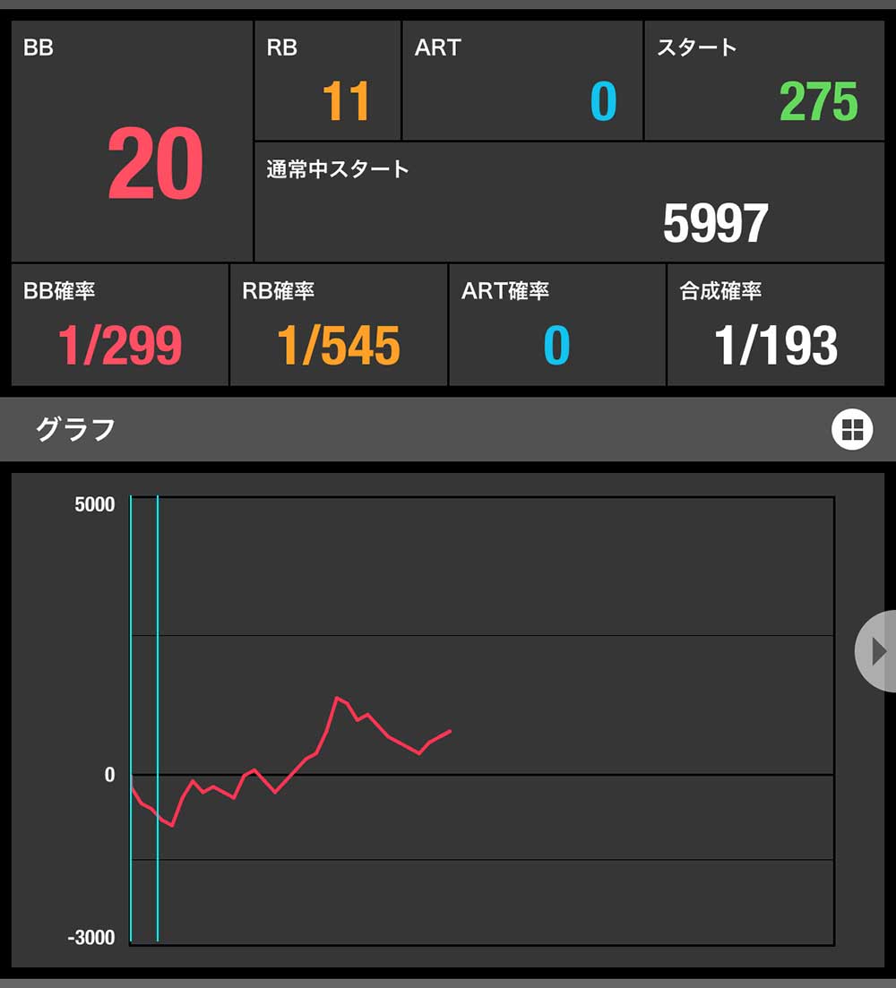 右隣(候補台)に座れていれば3000枚。相変わらずの狙い台が噛み合わない。