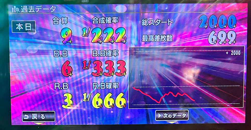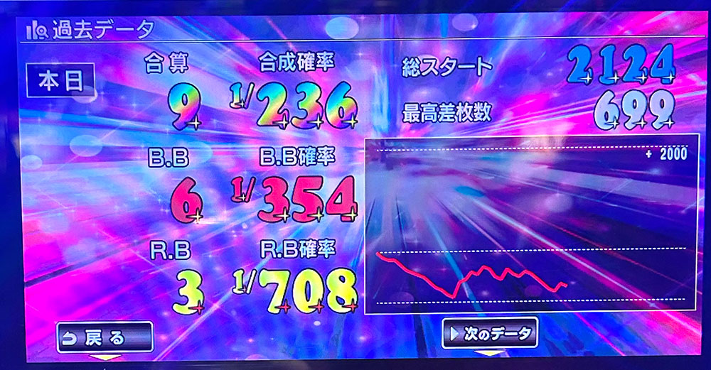 逆に設定1.2だったとしてもこんなにハマってはいけません。むしろ、ちょっと連荘して高設定か?と思わせてくれた方がのめり込めます。