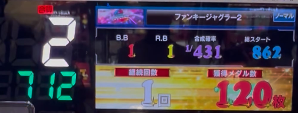 それでもここ(712G)までハマったなら戻ってくる。それがジャグラー。設定1でも166Gに1回は当たる仕組み。現在合算1/871